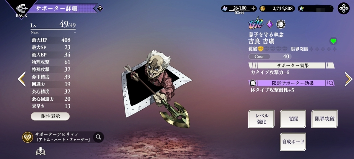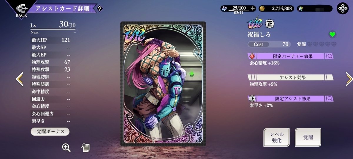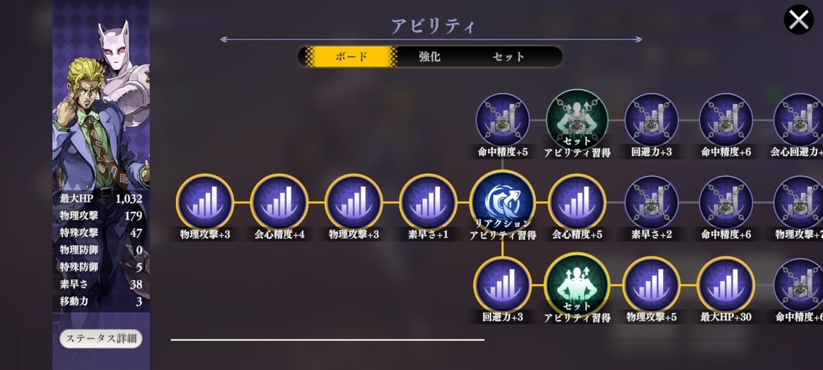 SRだと仗助(治療)がかなり優秀。SRはガチャで重なりやすいので序盤は活躍します。