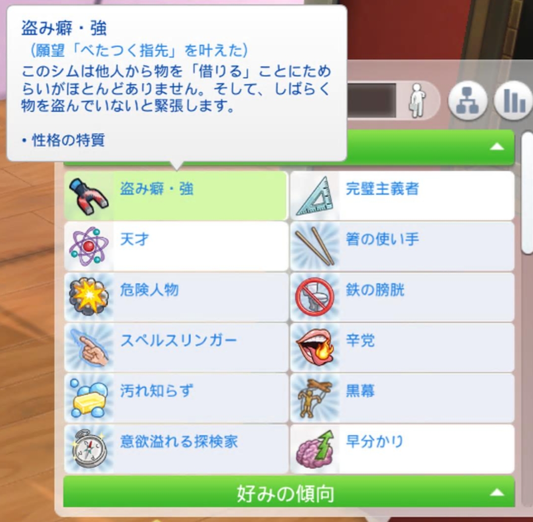 獲得した特質『遊び人』はシムから嫉妬されなくなります。今は境界線で嫉妬しないよう設定できるようになったので、正直いって需要はないです。場を繋ぐために挑戦しただけなので。