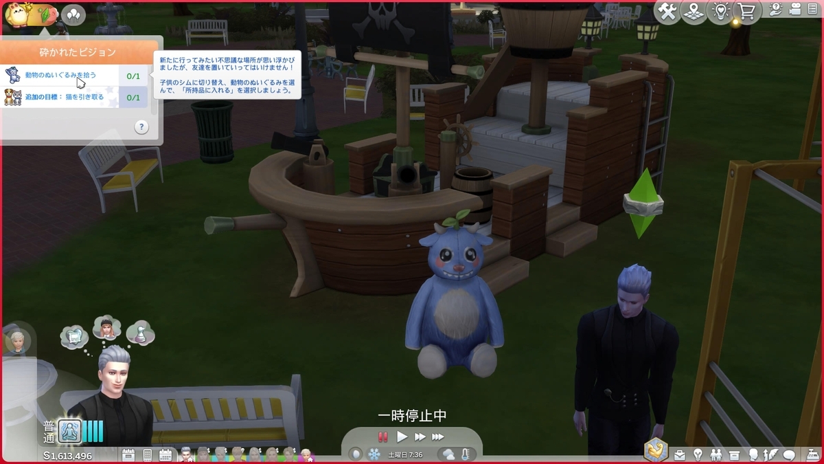 開幕早々、シムが自律でぬいぐるみに話しかけに行ってしまったので、一番最初のタスクを確認する暇もありませんでした。※移動が吸血鬼の疾走だったため一瞬の出来事。